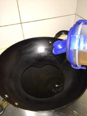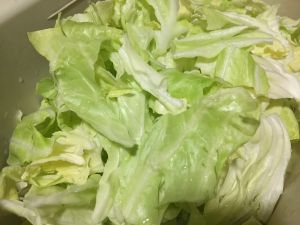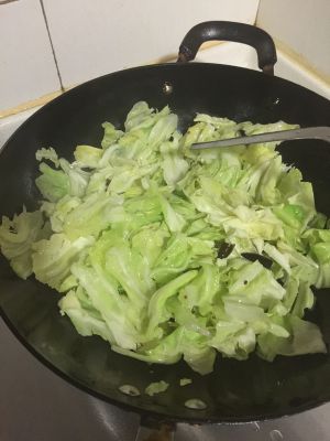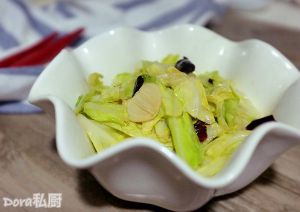 加入莲白,再加入醋一勺,糖1小勺,盐,鸡精