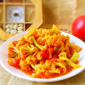 锅烧热后倒入油,然后放入葱花爆香后,倒入西红柿和番茄酱翻炒均匀后在倒入菜花翻炒。然后加入水,盖上锅盖,炖至三分钟。之后倒入淀粉水和鸡精调味。最后加入一点点的香油出锅即可。