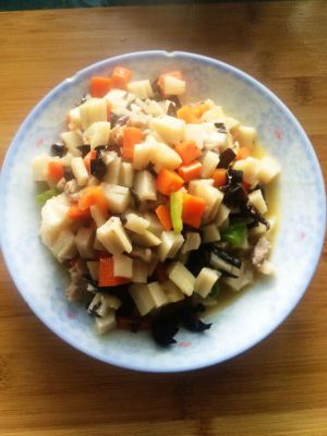 起油锅,先下肉丁,再下其他食材,放入适量料酒和盐,盖锅煮五分钟