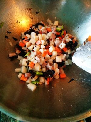 各种食材切丁,肉用生粉黄酒和一点点盐腌制三分钟