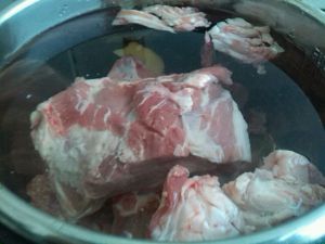 将羊骨、羊油、羊肉放一起在煮锅内,姜片一起加入,一定记住只能放姜别的什么香料不放,不然汤色不白,盐也不放,(煮纯汤)