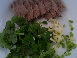 羊肉切片、放蒜蓉、油辣子、香葱末或香菜末