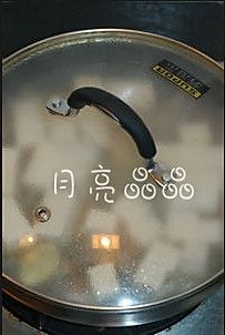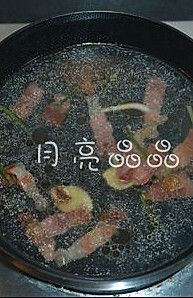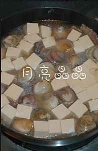 蛤蜊清洗干净后,捞出沥干。火腿切块,内脂豆腐切小块。锅烧热放一点点油,把火腿片放入中小火煸出香味。