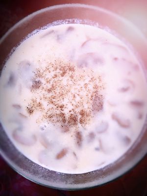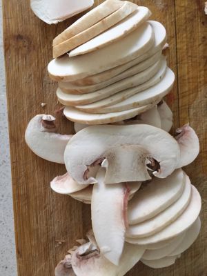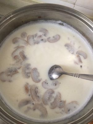 口蘑切片,锅里烧热放橄榄油少许放入口蘑翻炒均匀加一碗水搅拌一下,接着倒入我冲好的牛奶不停的搅拌顺着一个方向,这个过程用的都是小火,搅拌的差不多了火调到中小火煮沸,不能盖锅盖哦