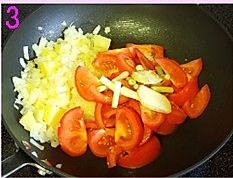 倒入切成块的番茄、葱段、姜片继续翻炒至到番茄变软,溢出红色汤汁;