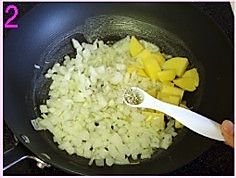 锅洗净,涂抹适量黄油,放入洋葱丁、去皮切块的土豆,少许干迷迭香,炒出香味;