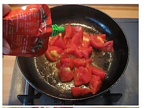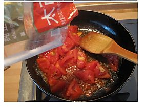 锅中放油烧热后,放入蒜片炒香后加入蕃茄翻炒,并加入适量蕃茄酱翻炒几下;