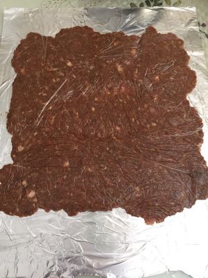 把肉馅铺在锡纸上,盖上保鲜膜用擀面杖擀薄