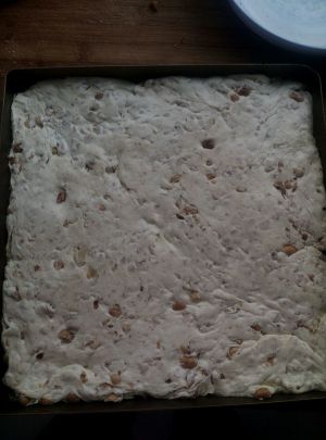 关火后把花生碎倒入牛轧糖锅内搅拌均匀就可以出锅了!牛轧糖倒入方形烤盘内压平!