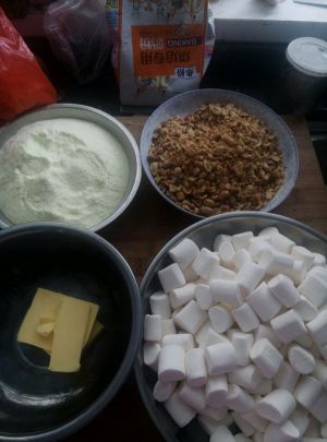 黄油放入不粘锅内小火融化后倒入棉花糖翻遍至完全融化!(黄油融化的步骤图忘记拍了!)