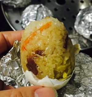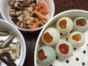 咸蛋开出一小口只留蛋黄,糯米经水泡至少4小时后加油盐酱油老抽搅拌,用小勺子装进蛋壳里切成颗粒的腊肉鲜菇瑶柱虾米也一并均匀装紧去