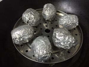材料都装进蛋壳后用锡纸包裹好,蒸40分钟