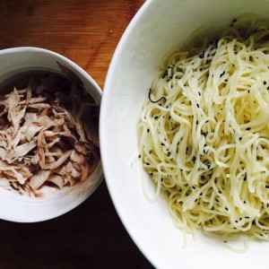 面条沥水后加少许芝麻油拌匀,撒上黑芝麻,鸡肉黄瓜芝麻酱拿出来拌匀