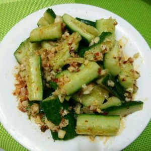 第一步:把黄瓜洗干净,然后用刀把黄瓜拍碎,然后再切成条状,装进碗里。