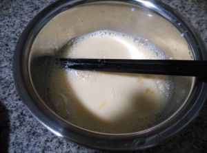 向蛋液中加入半袋牛奶(约100mL),再加一大勺糖,搅匀。此时蛋奶液应该有些粘稠了。