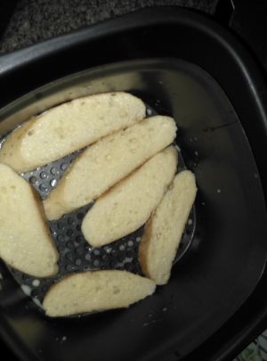 将法棍切成均匀薄片,厚度约为1.5cm。切的时候可以采用一定的角度,厚度尽量均一。