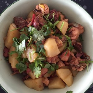 煮得只剩一点汤后,放青椒炒之,至汤干