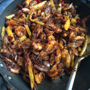葱姜蒜泡椒,爆炒,加入干辣椒花椒,加入洋葱,加入虾,加入香辣酱,些许盐(口味淡者可不放)放入糖,放入土豆,(焖一会,让土豆入味)撒入鸡精。出锅,撒入芝麻。