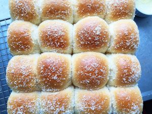 将主料中除黄油外的其它食材,放入面包机中,揉成比较光滑后加入黄油,继续揉到可以拉成大片的薄膜。