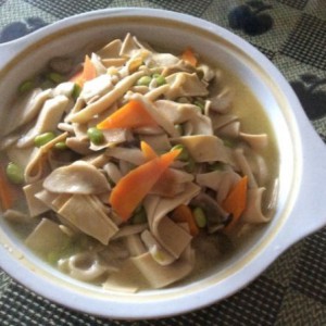 最后放入毛豆米,百叶榨菜,调味,加适量的盐即可。