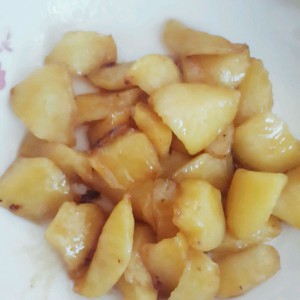 糖熬好后关火,然后将苹果放入锅内迅速翻炒几下,出锅即可