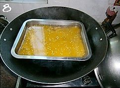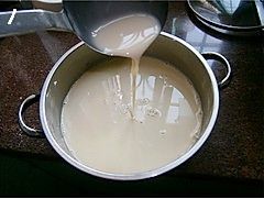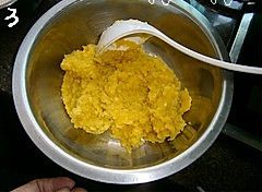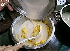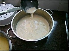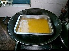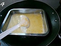 在容器中抹一层油(如果你用不粘的容器就不用抹油了),倒入2汤勺的粉浆,(这个就根据自己容器的大小啦,反正要铺满容器,高度也看自己喜欢啦,喜欢厚的倒多点,喜欢薄的倒少点。)烧开一锅水,水开后把装了粉浆的容器放进去,盖上锅盖,大火蒸5~6分钟至凝固;