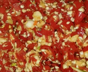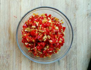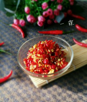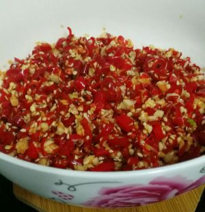 将辣椒在无水无油的面板上切碎,蒜、姜切末,放到容器中。加入白芝麻,盐,糖,白酒拌匀。