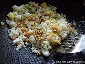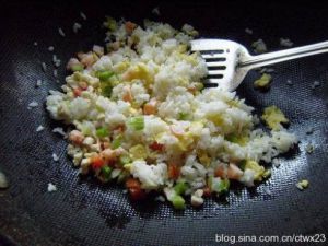 加入熟胡萝卜丁、熟西兰花茎丁、熟鸡肉丁、熟鲜虾丁炒匀,加适量盐翻匀