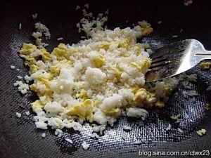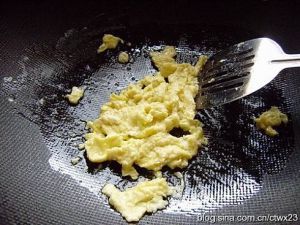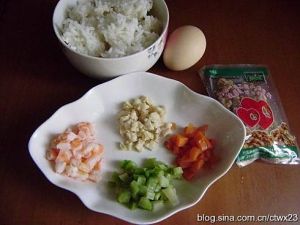 熟盐水虾去壳,切成小丁;熟鸡肉丝切成小丁;鸡蛋加适量盐打散