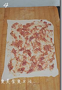 在擀好的面片上涂上调好味道的肉末,除去一条长边,另外三条边都留一公分左右不抹肉末