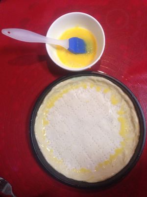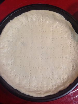 醒好后的面团用擀面杖擀成和披萨盘差不多大小的饼状披萨盘刷一层薄油防粘,饼皮放入披萨盘用手整形,边缘高一些(可在手上沾些水),然后用叉子在面皮上戳出一排排的小洞(防止烤拱起)