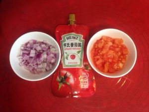 2:【做披萨酱】把番茄去皮切碎,洋葱切碎,准备好番茄酱。
