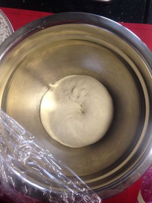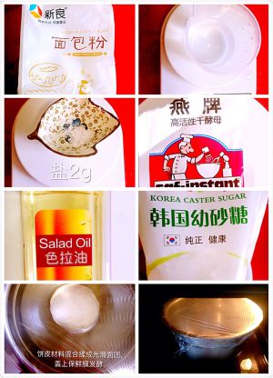 把干酵母融化在水中搅拌均匀静置5分钟(活化酵母)然后把面粉,糖,盐,油,混合,最后用准备好的酵母水边倒边搅拌,用手揉成一个三光(盆光,手光,面光)的面团,蒙上保鲜膜静置发酵。