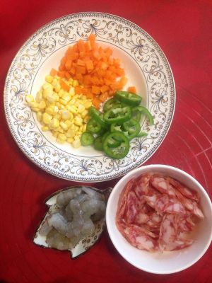 鲜虾去壳,腊肠2条切成薄片,3排玉米粒,半截青椒切圈去籽,胡萝卜一小段切成小粒。