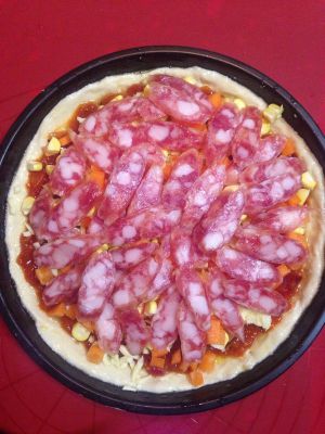 铺上胡萝卜丁和玉米粒然后铺上腊肠