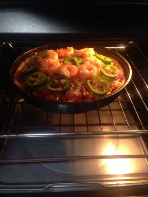 摆好虾仁青椒圈再撒适量马苏里拉