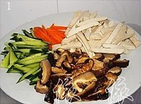 冬菇用温水泡软,捞起切丝,水不要倒掉,胡萝卜切丝,黄瓜切丝,北豆腐切丝;