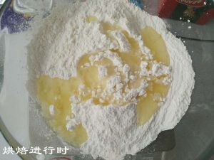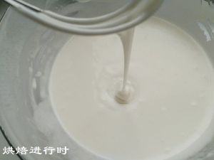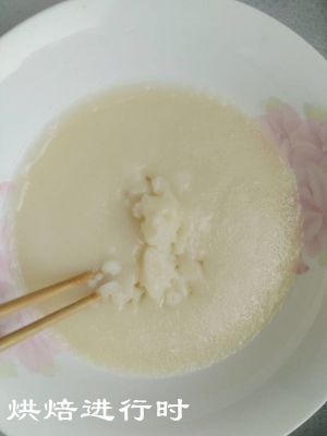 倒入水,用手动打蛋器慢慢搅匀,开始会有点难,慢慢就会成比较稀的面糊了。注意配方中的水针对的是三象的糯米粉,如果用其他,可以最后留点水,看面糊的状态如图就可以了。
