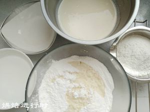 准备好所有的材料,烧一锅开水备用,淡奶油称好放入冰箱中。