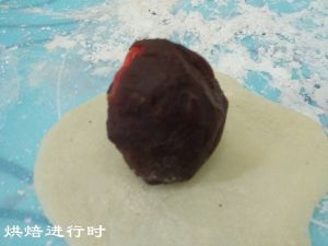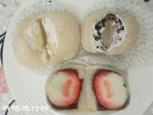 拿出皮,轻轻拉扯一下。包馅。水果的一般就是皮上一层奶油,几块水果,再放点奶油,对角线把皮收起来,最后在上面捏紧,千万不能碰到奶油。可以把上面多余的面揪掉,抹一点手粉,反过来放到软纸托中就可以了。奥利奥口味也非常好吃,提前拿个小碗,把奥利奥碎和奶油拌在一起就可以了。草莓大福就是整个草莓外面包一层豆沙馅,大福的皮要大一点。
