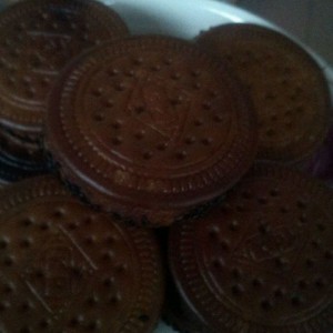 先把面团揉圆拍成饼状!尽量薄一点我的太厚了!放在一块饼干上再拿一块饼干轻轻压在上面