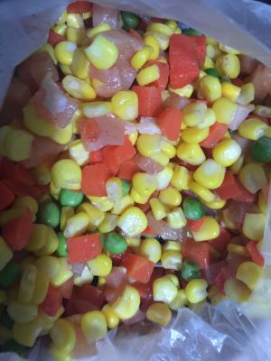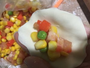 玉米用热水煮沸五分熟即可,用勺子刮下来.放在容器里,胡萝卜切粒,大小自己掌控不要太大不好包,青豆超市里有卖,最好用鸡肉,这样健康。用少许盐、海天酱油、芝麻油、鸡精搅拌好冷藏待用,这个时候就可以和面了