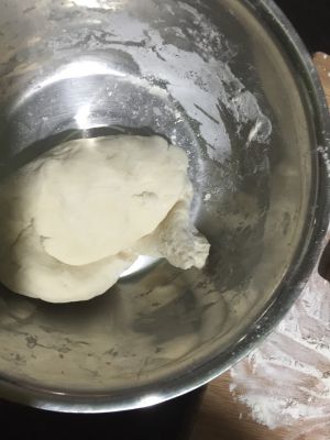用温水一碗倒入面粉里开始搅拌,手揉至面团光滑,面案上撒上生面粉,面团揉搓成团开始准备擀皮