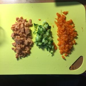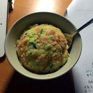 这时热锅,放一点点油,把香肠放进去 炒的有点焦焦的那种的放入胡萝卜,炒一会后把土豆放进去,疯狂的用铲子把它弄碎,这个时候神奇的东西来了!放点水,然后就很容易弄成泥了。