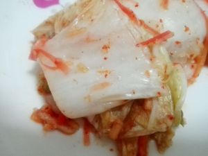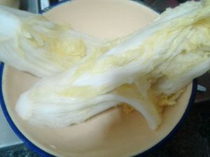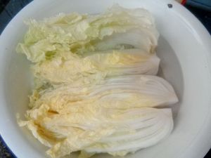 将大白菜切成四部分,每一层都均匀的抹上盐,然后放入盐水中,泡大约十个小时左右(根据盐的多少来定时,盐多的话六个小时左右就差不多,可以自己撕一点尝尝),直到白菜变软,脱水