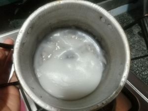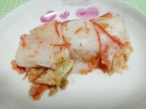 将糯米粉和水以1:10的比例兑好,倒入锅中用小火煮开,成糊状,边煮边搅拌,然后晾凉。糯米粉的作用是能让食材很好的混合在一起以便于粘在白菜上更好的入味哦!
