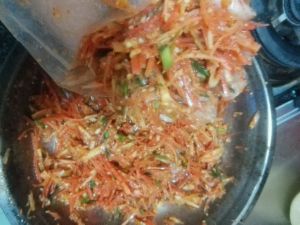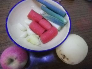 准备好的食材切丝,胡萝卜(或者白萝卜),苹果,梨,大葱,芹菜(或者韭菜)都是切丝,姜和蒜剁碎。