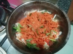 将切好的材料统一放入盆中,加入辣椒面,白砂糖和韩式辣椒酱。抓匀,在中途加入已经凉了的糯米糊。