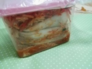 将酱料均匀的涂在白菜上,一层一层的涂,让整棵白菜都沾上酱料,处理好的白菜放进干燥的保鲜盒内