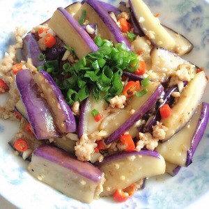 锅内少许油放入肉末,炒至变色加姜蒜炒香,然后加入红辣椒翻匀即可,放茄子之后马上倒进刚刚准备的酱汁,翻炒均匀20秒左右就出锅了!